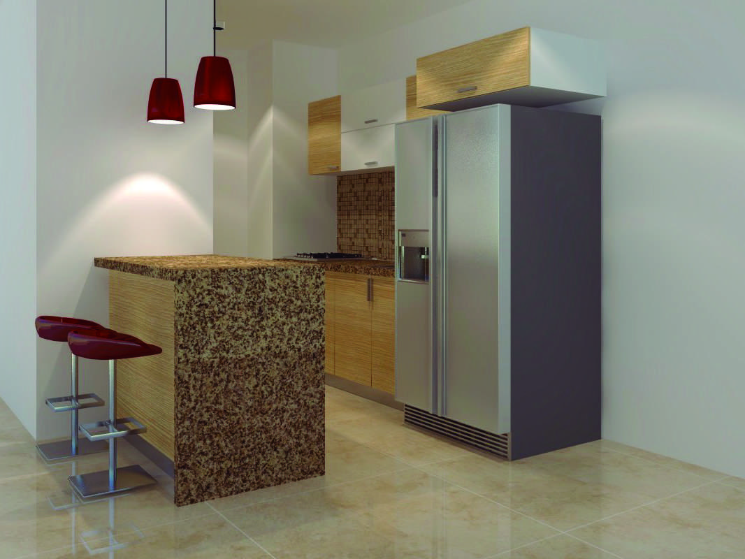 • Muros de cocina con estuco plástico y Pisos en porcelanato beige de 60×60.