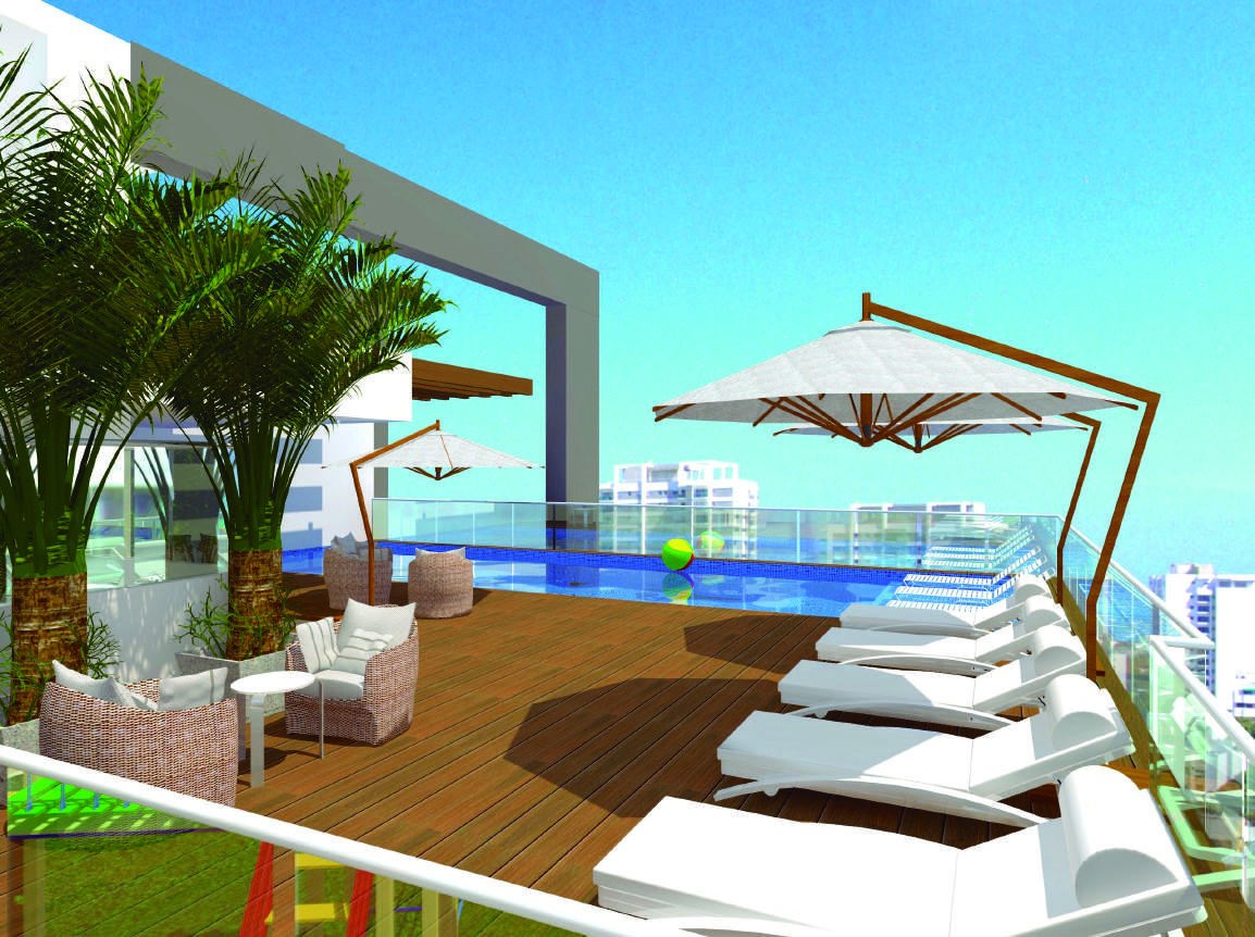 En el último piso se encuentra ubicada la zona social, la cual cuenta con piscina, solarium, espacio BBQ, salón social, zona de juegos para niños, espacio para gimnasio y baños.