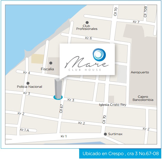 Proyecto Mare Club House, se encuentra ubicado en Crespo Carrera 3ra con calle 67 esquina. Con espectaculares apartamentos de 2 y 3 alcobas desde 87.28 Mts2 hasta 115.29 Mts2.