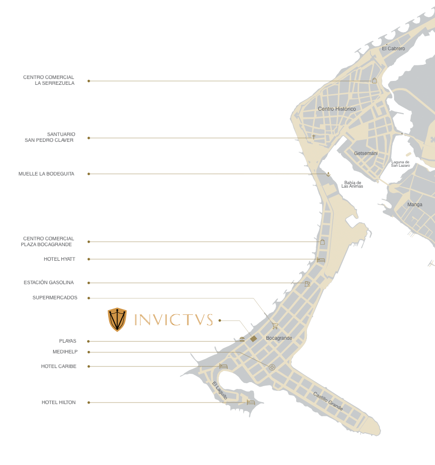 INVICTVS emerge en el corazón de Bocagrande, una hermosa península rodeada de agua, que pone a su alcance lo mejor de una ciudad con siglos de historia; que hoy es reconocida como uno de los destinos más deseados del mundo. Una zona con una especial energía, donde, a cualquier hora del día o de la noche, algo fascinante está pasando.