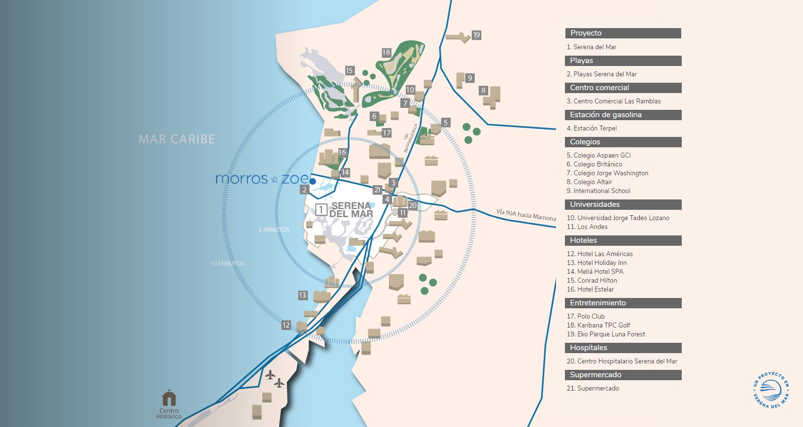 Morros Zoe está ubicado en el macro-proyecto Serena del Mar, una ciudad dentro de la ciudad, ubicada en un terreno situado a doce kilómetros del Centro Histórico de Cartagena, un desarrollo urbanístico de más de 1.000 hectáreas de extensión que tiene como propósito garantizar la calidad de vida de todos sus habitantes a partir de la generación de oportunidades, en completo respeto por el medio ambiente.